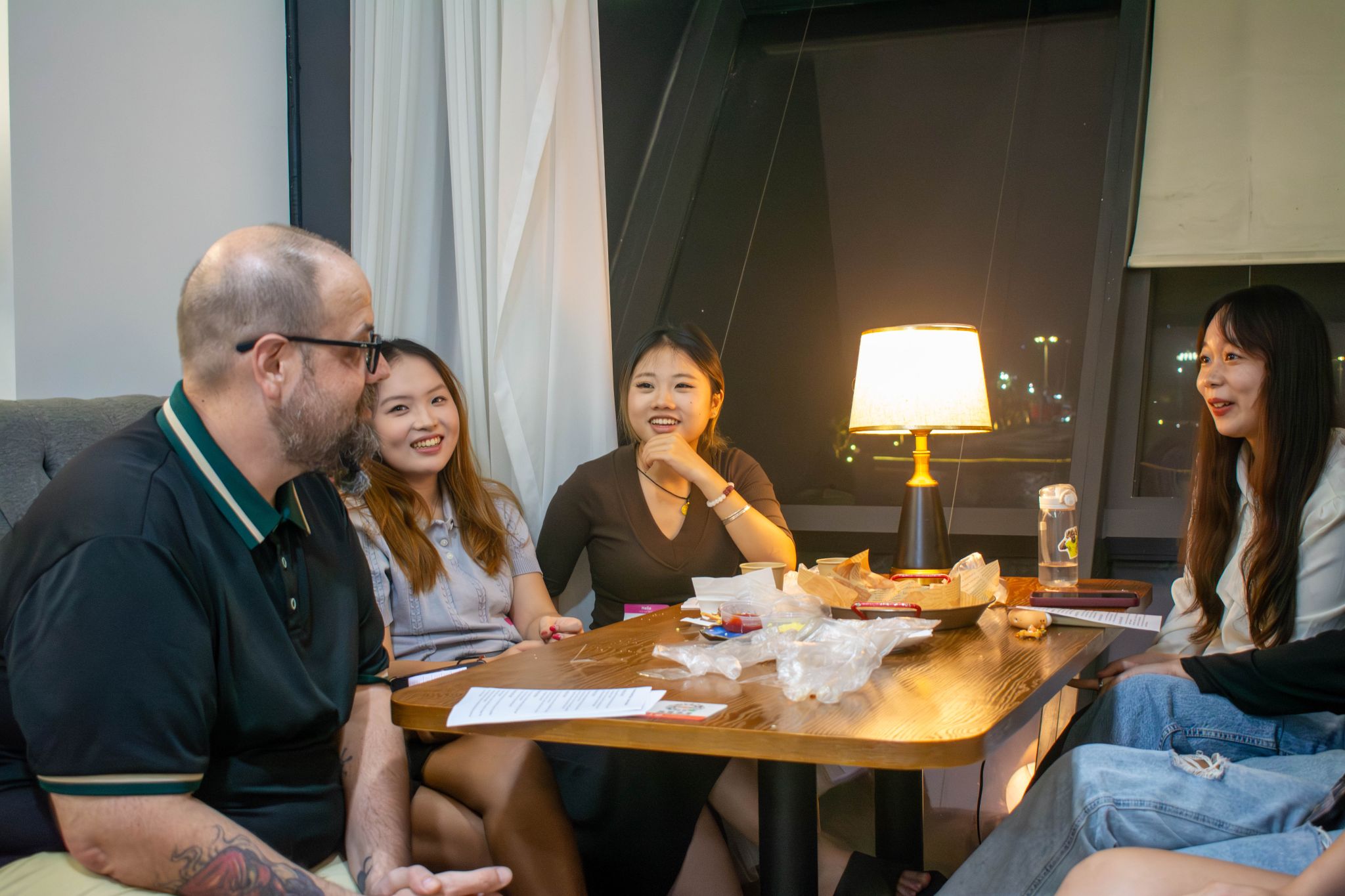 最后,在外教Kay与学生的互动的环节中,现场气氛变得格外轻松活泼。他引导大家讨论适合与朋友见面的地点,从熟悉的食堂、教室、图书馆,到充满文化差异的夜店、酒吧,引发了阵阵欢笑与好奇。随后,他鼓励同学们向伙伴介绍自己的专业、分享所学所得,并让朋友用词来形容自己,将语言练习融入真实的互动与趣味的自我探索之中。