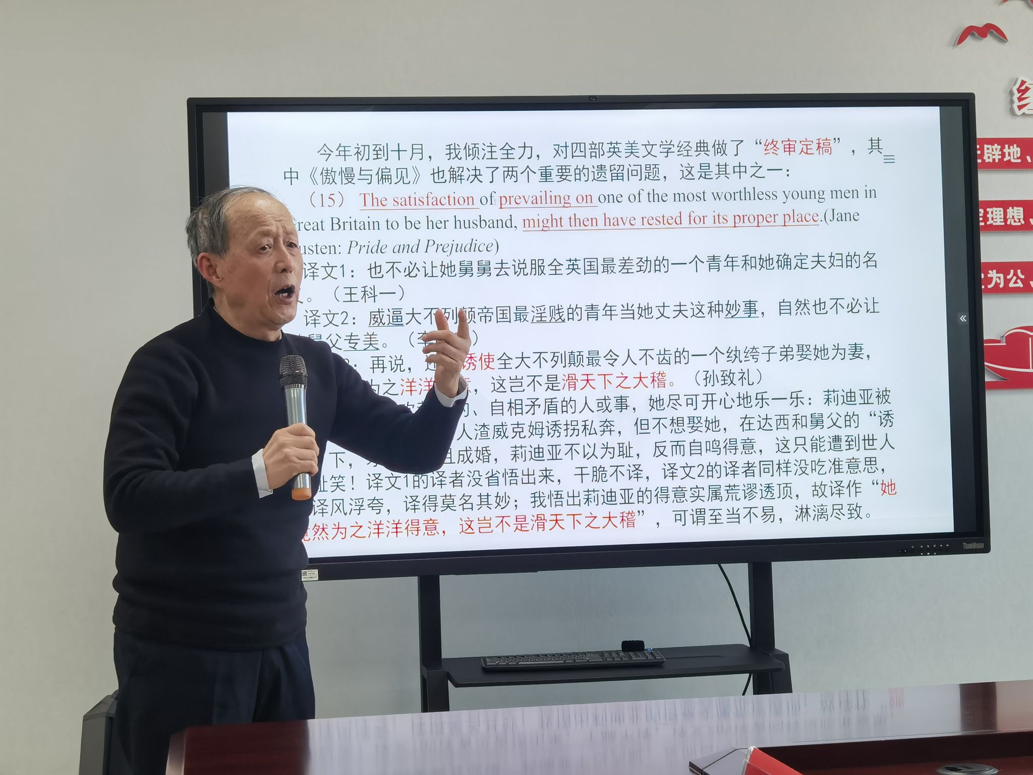 11月21日下午,我国著名翻译家及翻译理论家、中国翻译协会“翻译文化终身成就奖”获得者孙致礼教授应邀为十大网上博彩网址导航 师生作题为“我的英美文学翻译之道”的学术讲座。孙致礼教授是原解放军十大网上博彩网址导航 英语语言文学专业学术带头人、博士生导师,代表性译著《傲慢与偏见》《瓦尔登湖》《老人与海》等脍炙人口、长销不衰。本次讲座由院长唐艳芳主持,博彩网址导航 教师代表及翻译专业硕士研究生三十余人参加。